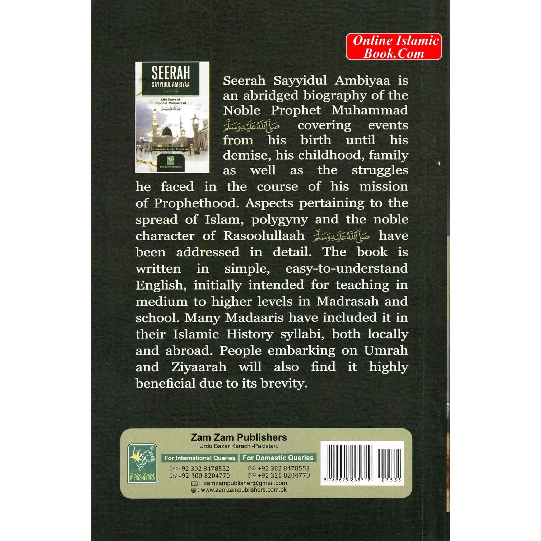 Seerah Sayyidul Ambiyaa is an abridged biography of the Noble Prophet Muhammad events covering from his birth until his demise, his childhood, family as well as the struggles he faced in the course of his mission of Prophethood. Aspects pertaining to the spread of Islam, polygyny and the noble character of Rasoolullaah have been addressed in detail. The book is written in simple, easy-to-understand English, initially intended for teaching in medium to higher levels in Madrasah and school. Many Madaaris have included it in their Islamic History syllabi, both locally and abroad. People embarking on Umrah and Ziyaarah will also find it highly beneficial due to its brevity.