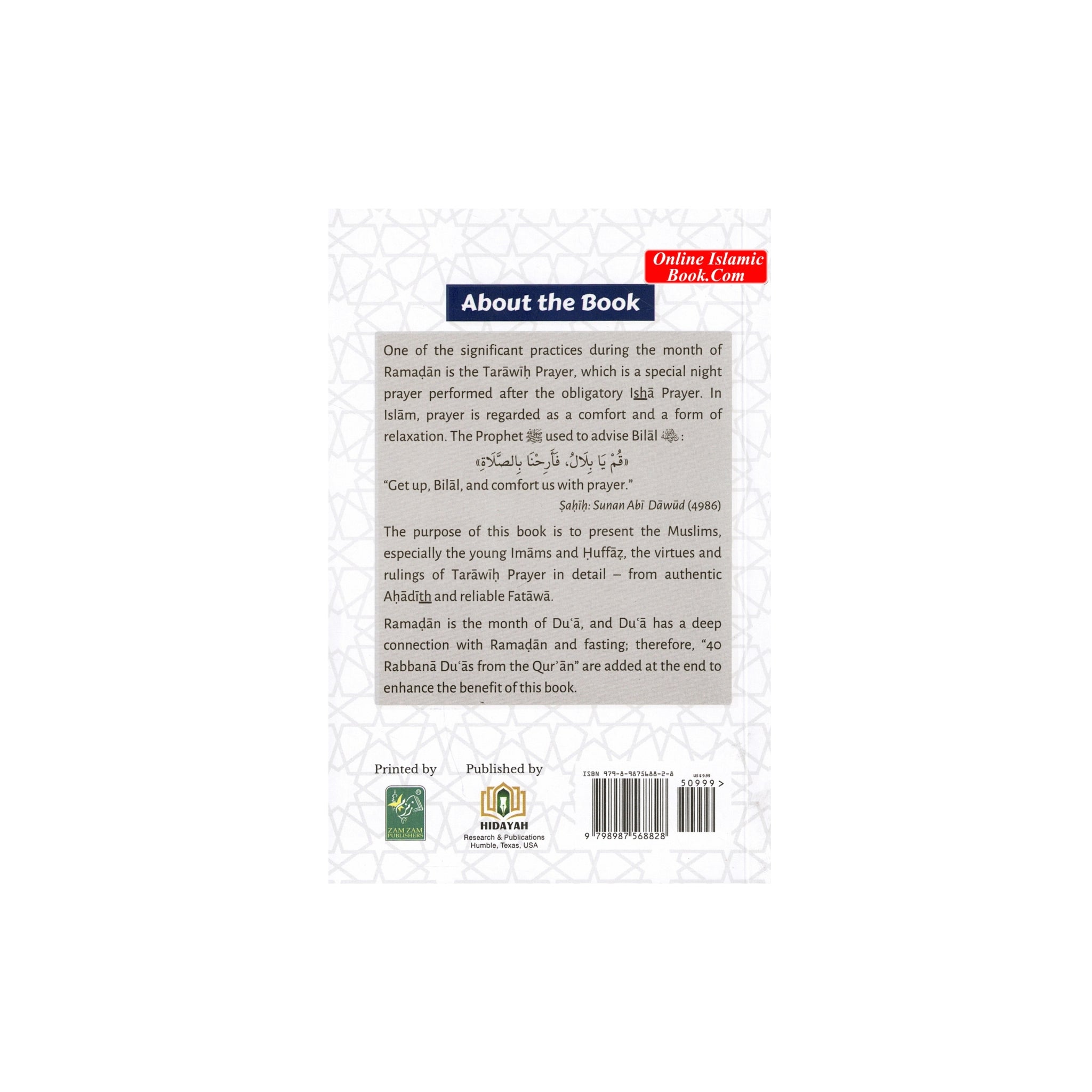 The purpose of this book is to present the Muslims, especially the young Imams and Huffaz, the virtues and rulings of Tarawiḥ Prayer in detail from authentic Aḥadīth and reliable Fatāwā.