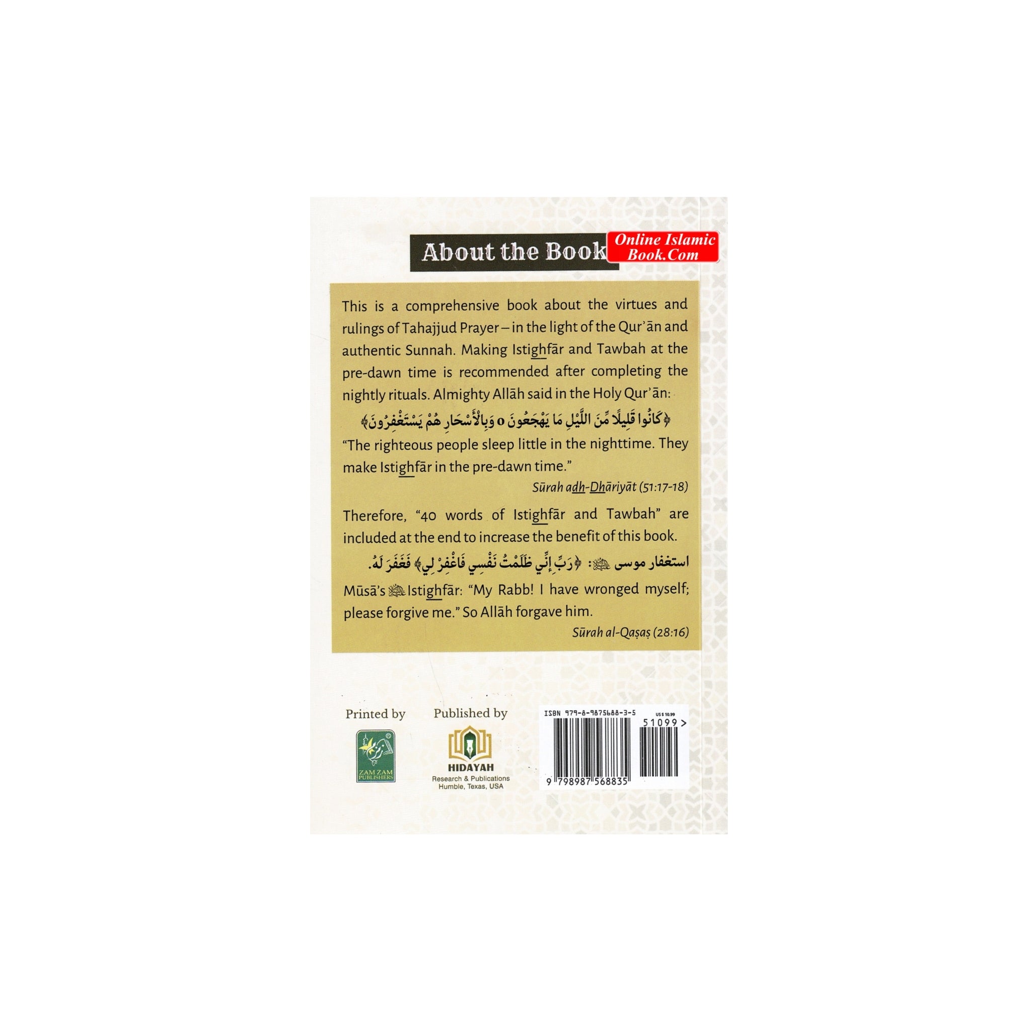 This is a comprehensive book about the virtues and rulings of Tahajjud Prayer-in the light of the Qur'an and authentic Sunnah. Making Istighfar and Tawbah at the pre-dawn time is recommended after completing the nightly rituals. Almighty Allah said in the Holy Qur'an:
